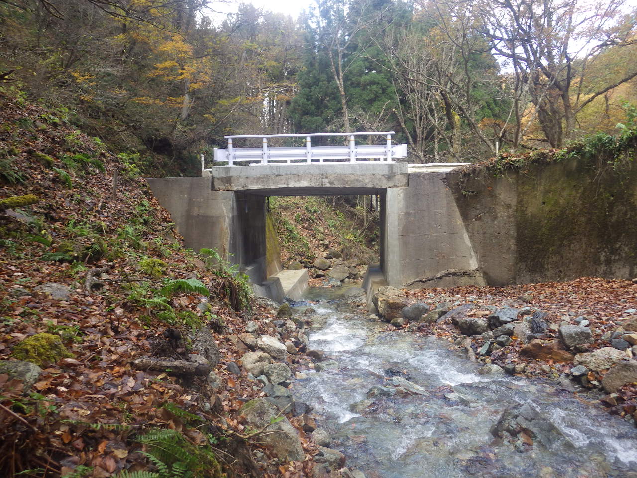 本工事は既存の林道の機能強化を行う改良工事です。老朽化した橋の補強工事を行いました。