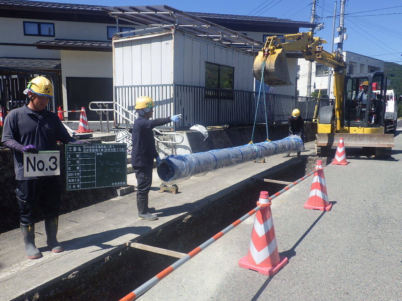 口径300㎜の地震に強い新しい送水管を布設しました。工事場所は、一般市道を片側交互通行の交通規制で行うため、安全には十分注意を払い施工し、無事に完成しました。